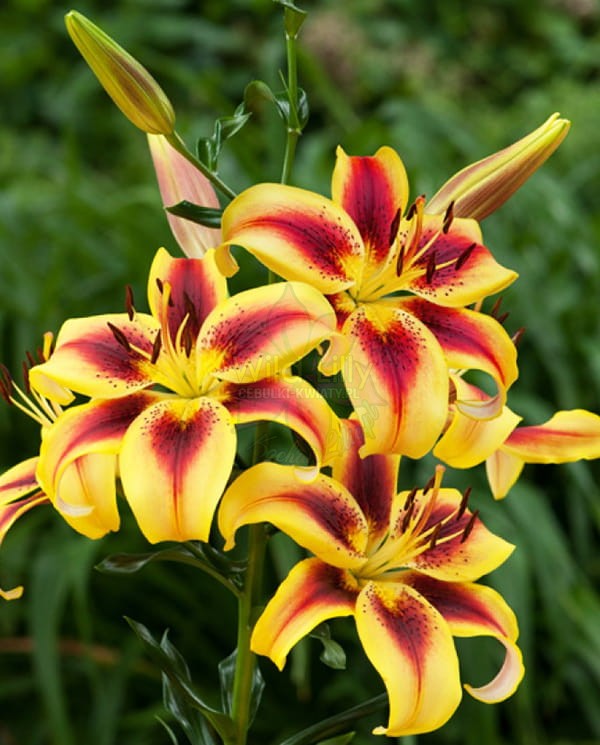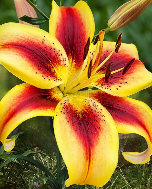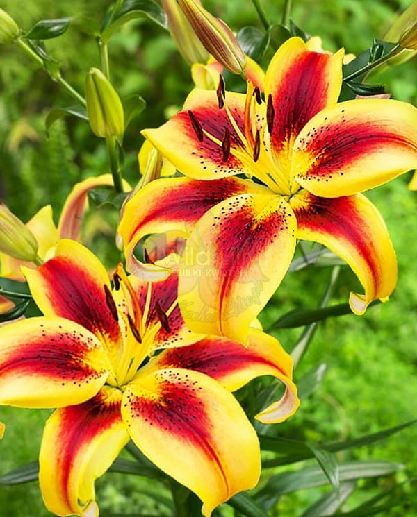 Lilia Viva La Vida to niezwykła hybryda Asiatic x Oriental (AOA), która zachwyca obfitymi, przyciągającymi wzrok kwiatami. Jej złociste płatki są hojnie zdobione intensywnymi czerwonymi płomieniami biegnącymi wzdłuż środka każdego płatka, tworząc spektakularny widok. Roślina osiąga wysokość około 100 cm, co czyni ją doskonałym wyborem do bukietów, aranżacji wnętrz oraz ogrodów.