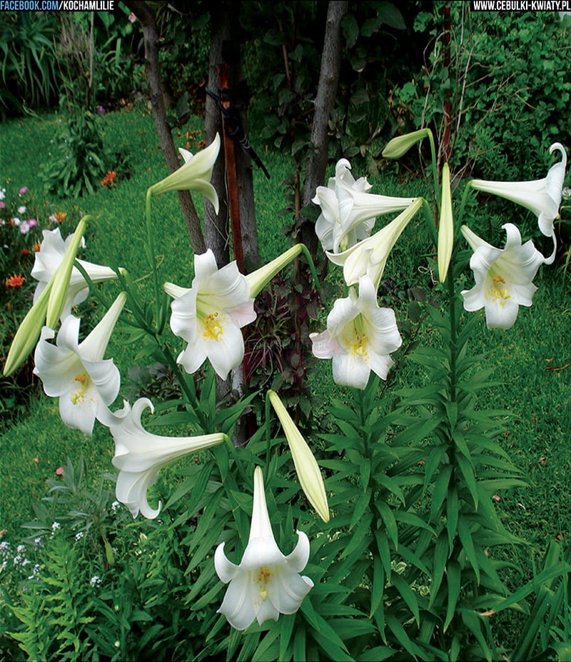 Najbardziej rozpoznawalna ze wszystkich lilii, jej wyselekcjonowane odmiany są hodowane w milionach każdego roku. Lilia White Heaven zwana także jako „lilia wielkanocna”, to lilia longiflorum której pierwotnym domem były południowe wyspy Japonii. Choć w doniczkach często przez producentów są zmuszane do kwitnienia w okresie wielkanocnym, zwykle kwitnące w ogrodzie w lipcu i sierpniu. White Heaven to bardzo słodko pachnąca lilia Longiflorum z kwiatami, które mogą urosnąć do około 20 cm średnicy. Ta idealnie biała lilia z nutą zieleni w sercu jest zdecydowanym faworytem naszych klientów, kwiaciarni, szczególnie tych, którzy lubią mieć ją jako kwiat cięty w domu lub na weselach. White Heaven dorośnie do około 100 cm w pierwszym roku, ale może osiągnąć nawet 150 cm, gdy ustabilizuje się na przestrzeni lat. Niezawodna, łatwa w uprawie, uwielbiana przez pszczoły i motyle. Sadź w grupach co najmniej 3 cebule, aby uzyskać efektowny wygląd! Kwitnąca na początku połowy lata lilia ta stanowi doskonałą roślinę rabatową, zapewniając czysto biały kolor i kontrast z byliną rabatową i pięknie komponuje się z jednorocznymi i innymi letnimi kwiatami cebulowymi.
