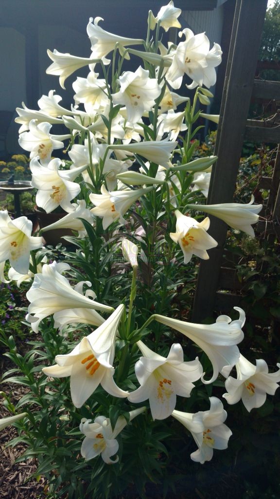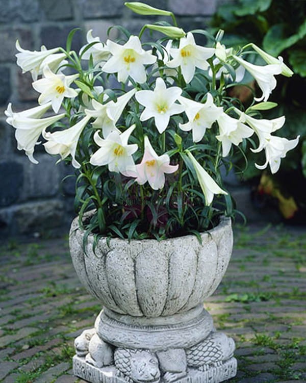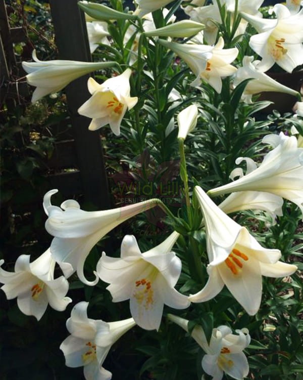 Lilie longiflorum to gatunek pochodzący z południowych wysp Japonii i Tajwanu. Posiada duże, pachnące, skierowane na zewnątrz, w kształcie trąbki, czysto białe kwiaty o długości od 12 do 20cm, które kwitną w lipcu-sierpniu (wielkanocne lilie kwitnące w Wielkanoc zostały wymuszone) na sztywnych łodygach rosnących do 120cm. wysokości. Łodygi są pokryte wąskimi, lancetowatymi, ciemnozielonymi liśćmi (o 12-19cm. długości). Lilie Longiflorum są czasami nazywane liliami wielkanocnymi. Hybrydy Longiflorum (L. longiflorum i L. formosanum). Lilia longiflorum łatwo rośnie w średniej, średnio wilgotnej, przepuszczalnej glebie w pełnym słońcu do półcienia. Preferuje bogate, organiczne gleby. Najlepiej z górnymi częściami roślinami w pełnym słońcu i korzeniami w cieniu. Dlatego ściółkuj wokół roślin, aby strefa korzeniowa była chłodna ochroniona od nagrzewania. Może być również uprawiana w doniczkach lub pojemnikach, ale rośliny i kwiaty będą nieco mniejsze. Do doniczki można sadzić w dowolnym momencie od wiosny do jesieni. Sadzić w grupach po trzy, aby uzyskać najlepszą ekspozycję i odstęp ok. 25cm. od siebie. Cebulki potrzebują dobrej wilgoci przez cały rok. Nie dopuszczać do wyschnięcia gleby. Po kwitnieniu przycinaj rośliny dopiero wtedy, gdy liście i łodygi zżółkną. Rośliny mogą wymagać palikowania, jeśli rosną w zbyt dużym cieniu (łodygi słabną) lub w miejscach narażonych na silne wiatry. Lilie longiflorum są krzyżowane z mieszańcami azjatyckich lilii, znanymi jako lilie LA lub Longiflorum-Asiatics.